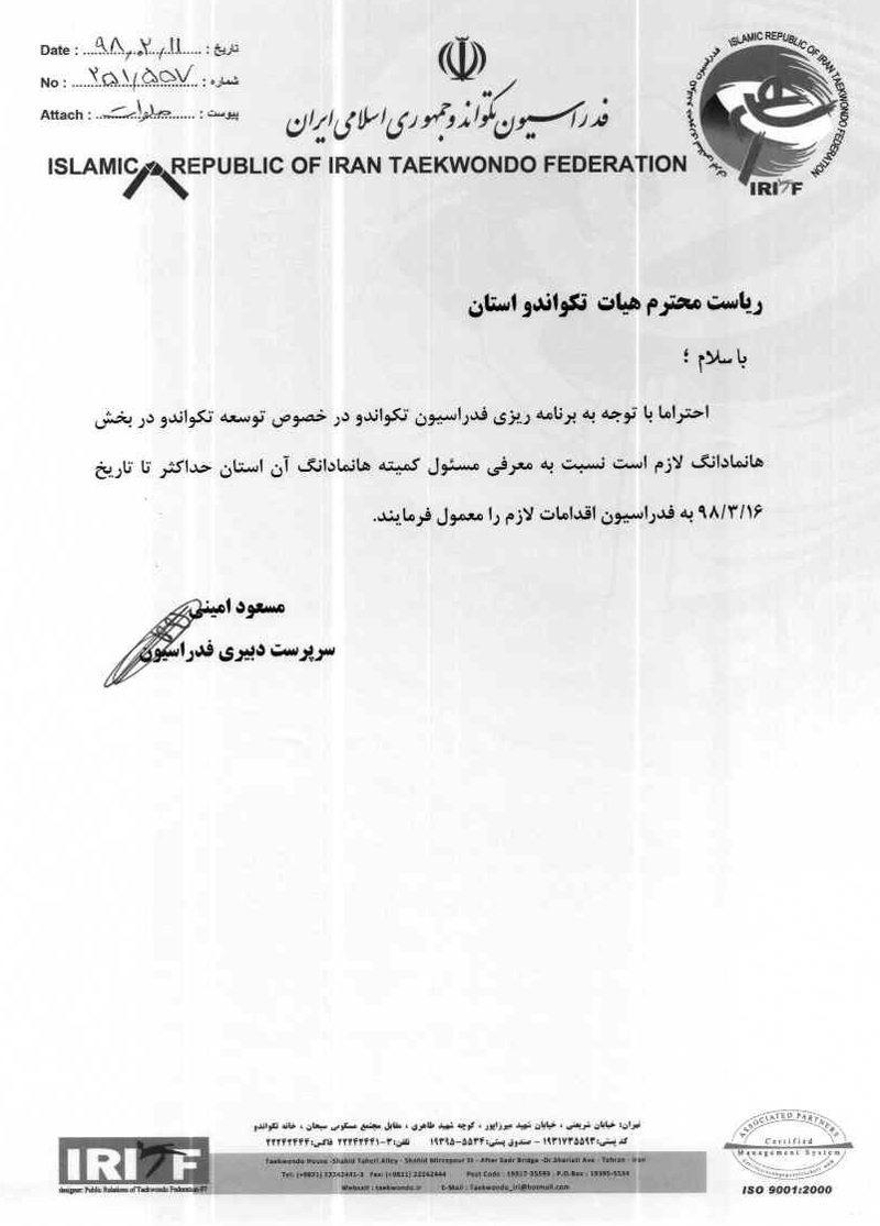 اطلاعیه شماره 251/557 اطلاعیه معرفی مسئول کمیته هیانگ استان ها