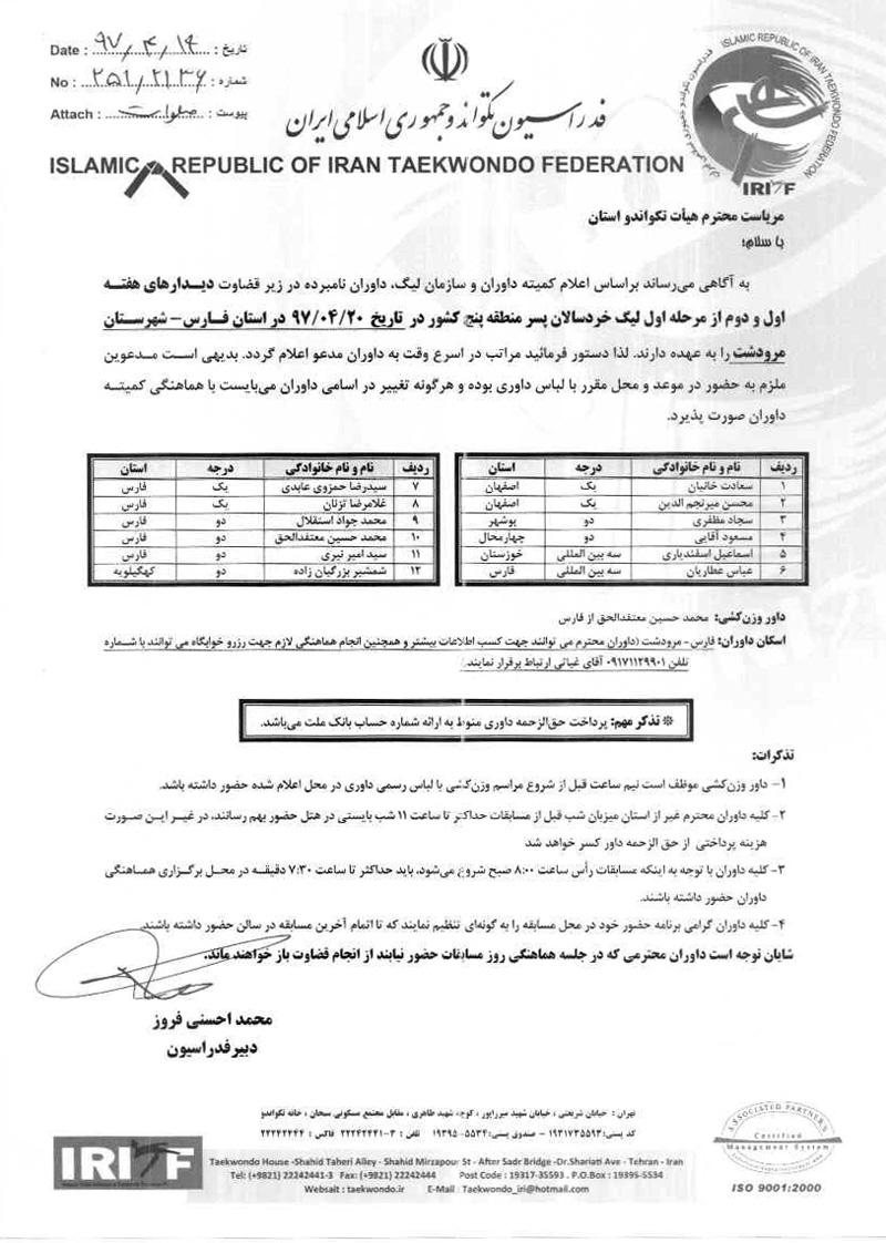 اطلاعیه شماره 251/2136 اطلاعیه اسامی داوران هفته اول ودوم از مرحله اول لیگ خردسالان پسر منطقه پنج کشور