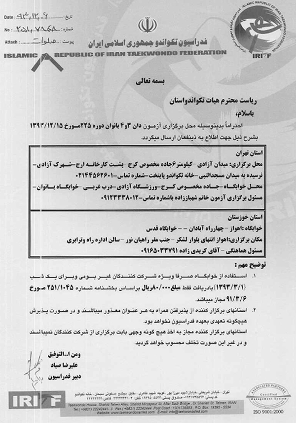 اطلاعیه شماره 7848/251 اطلاعیه محل برگزاری آزمون دان 3 و 4 بانوان دوره 225