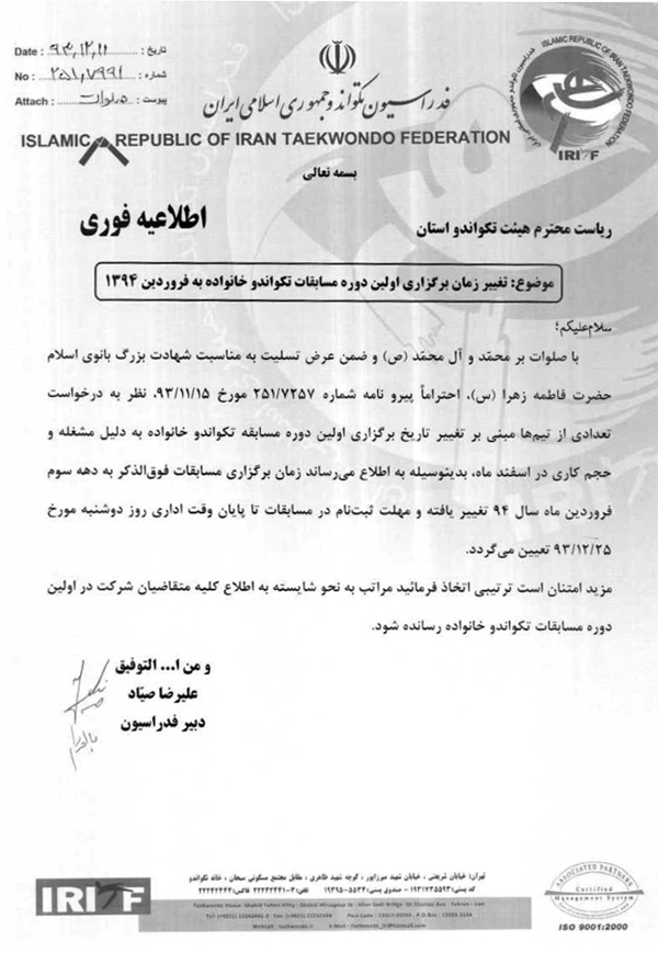 اطلاعیه شماره 7991/251 اطلاعیه تغییر زمان برگزاری مسابقات تکواندو خانواده