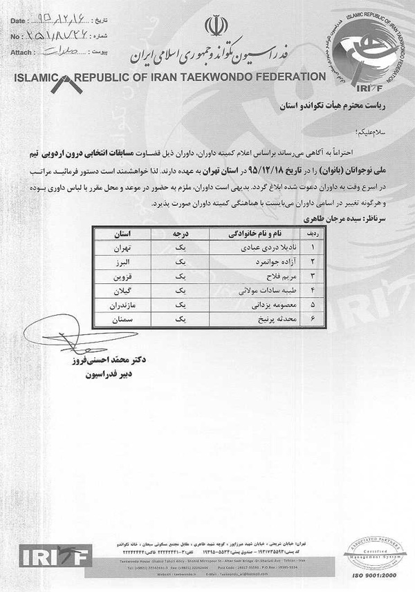 اطلاعیه شماره 251/8726 اطلاعیه اسامی داوران انتخابی درون اردویی تیم ملی نوجوانان بانوان