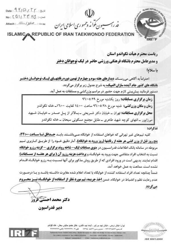 اطلاعیه شماره 251/3465 اطلاعیه برگزاری هفته سوم و چهارم لیگ نوجوانان دختر (جام آینده سازان المپیک )