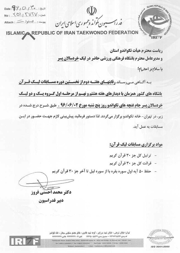 اطلاعیه شماره 251/3727 اطلاعیه هفته دوم از نخستین دوره لیگ قرآنی همزمان با دیدارهای هفته هشتم و نهم گروه یک خردسالان پسر