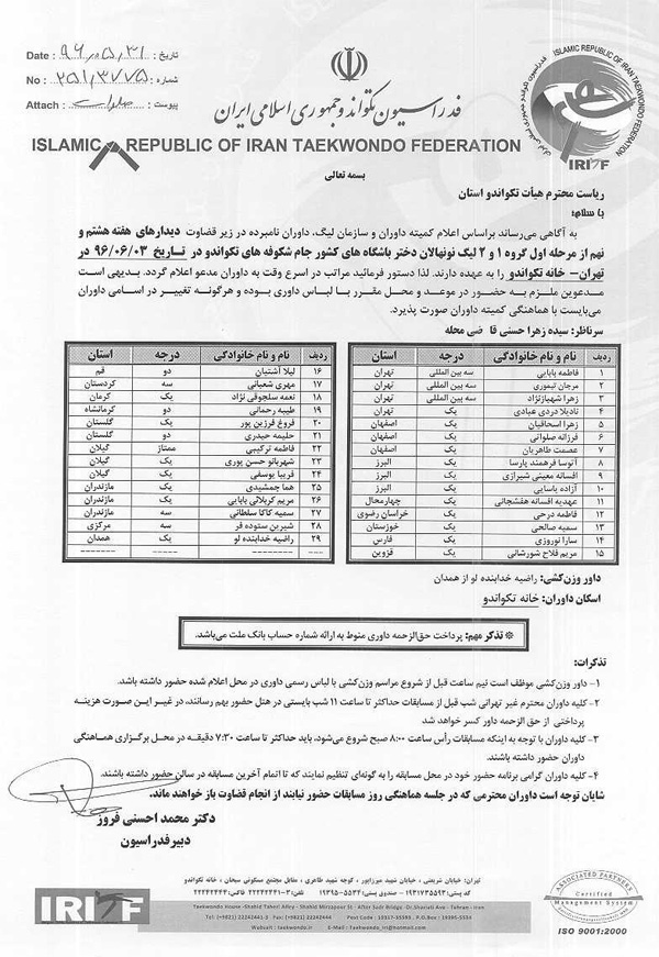 اطلاعیه شماره 251/3775 اطلاعیه اسامی داوران دیدارهای هفته هشتم و نهم از مرحله اول گروه یک و دو نونهالان دختر جام شکوفه ها
