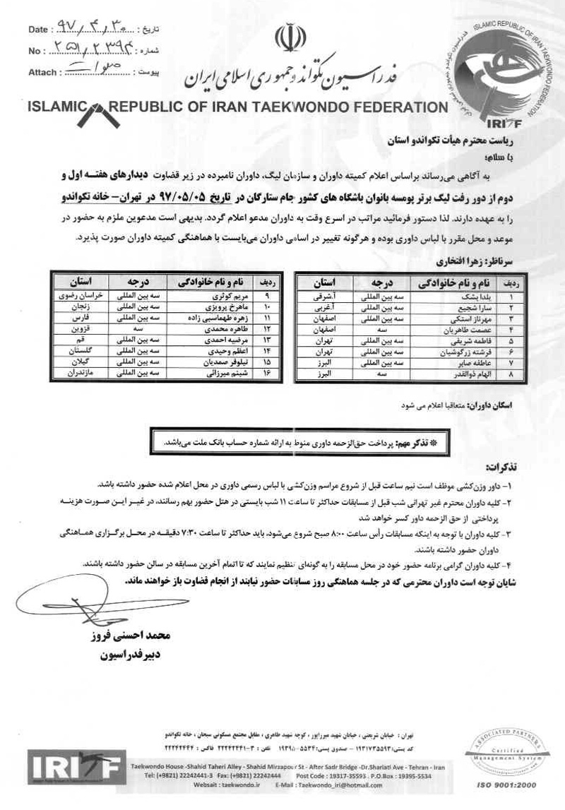 اطلاعیه شماره 251/2394 اطلاعیه اسامی داوران هفته اول و دوم از دور رفت لیگ برتر پومسه بانوان