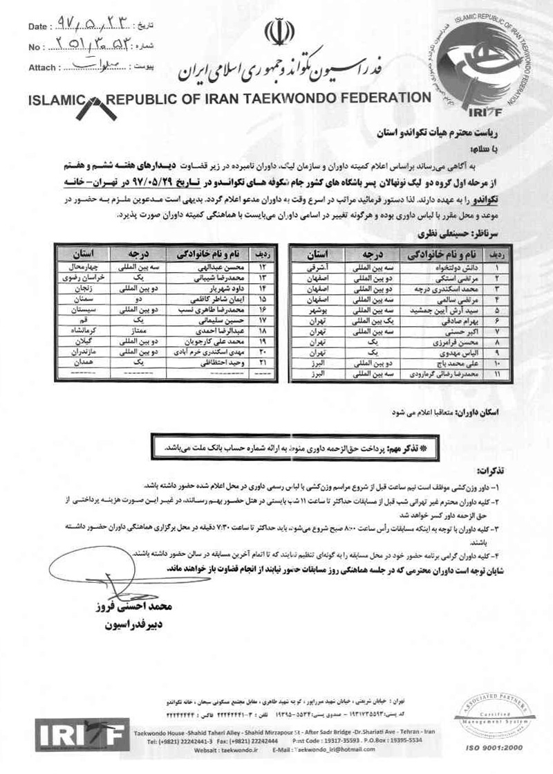 اطلاعیه شماره 251/3053 اطلاعیه اسامی داوران هفته ششم و هفتم مرحله اول گروه دو لیگ نونهالان پسر